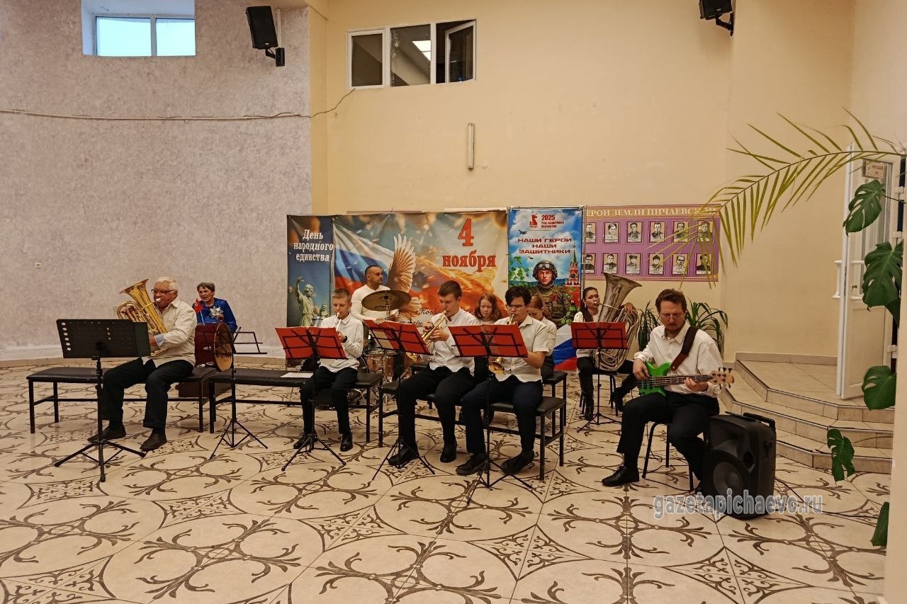 Открыло праздничную программу выступление музыкантов духового оркестра «Славяне» под руководством Данилы Назарова. Они исполнили известные патриотические и любимые многими композиции прошлых лет.
